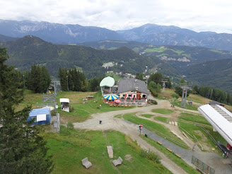Mit der Rax-Seilbahn fahren wir hinauf zum Gsolhirn auf 1545 m, wo an der Bergstation der Raxalm Berggasthof steht. Hier trenne ich mich von unserer Wandergruppe, da heute ein spezieller Weg auf mich wartet. Zunächst gehe ich zum Gatterlkreuz, wo sich ein schöner Ausblick auf den nahen Schneeberg bietet. Der Weg führt dann durch Latschen hindurch zum Kreuzungspunkt Praterstern auf der Rax. Dort bietet sich die Möglichkeit, zur Höllentalaussicht abzubiegen. Ich gehe zum Ottohaus, das hier unterhalb vom Jakobskogel (1737 m) steht. Für's Essen muss man heute einige Minuten lang anstehen. Draußen sitze ich mit Blick auf das Törl und den Alpengarten in der Sonne. Dann wähle ich den Seeweg, und wandere mit Blick auf die Lechnermauern zur Neuen Seehütte (1643 m). An der Wegkreuzung unterhalb vom Trinksteinsattel (1850 m) stehen schöne Wegweiser im Indianischen Stil angeordnet. Auf dem Göbl Kühn Steig wandere ich zum Waxriegelhaus (1361 m).